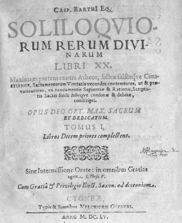 - Barth, Caspar : von <1587-1658>, Casp. BarthI eq. Soliloquiorum rerum divinarum libri 20. Maximam partem contra atheos, fictos falsosqve Christianos, sacramentorum veritatis vecordes contemtores, ut & & praevaricatores, ex fundamentis sapientiae & rationis, Scripturis Sacris sensu stiloqve consonae, Cygneae, 1655