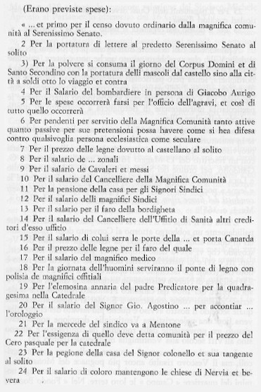 SCORRENDO IL DOCUMENTO SI NOTANO MOLTE VOCI INTERESSANTI ONDE COMPRENDERE LA VITA CIVILE ED AMMINISTRATIVA DI VENTIMIGLIA E SUO TERRITORIO: MA LE INFORMAZIONI DIVENGONO ANCORA PIU' INTERESSANTI ANALIZZANDO IL PUNTO 24 LADDOVE VIENE MENZIONATA UNA CHIESA DI NERVIA CHE CONFERMA PARTE DEI RILEVAMENTI FATTI DAL TEOLOGO APROSIO SU UN'ANTICA CHIESA DI NERVIA.