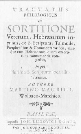 MAURITIUS MART., TRACTATUS PHILOLOGICUS DE SORTITIONE VETERUM HEBRAEORUM..., BASILEA, KONIG, 1692, IN 8°, PP. 16, 27,485 CON PARTE DEL TESTO IN EBRAICO. SI TRATTA DI UN RARO ED IMPORTANTE TESTO DI ASTROLOGIA E DIVINAZIONE, SCONOSCIUTO DA GRAN PARTE DEI REPERTORI E DOCUMENTATO SOLO DA CAILLET, 7257 CHE TUTTAVIA LO DESCRIVE PER SOMMI CAPI SENZA AVERLO MAI CONCRETAMENTE ANALIZZATO (ESEMPLARE DA BIBLIOTECA PRIVATA)