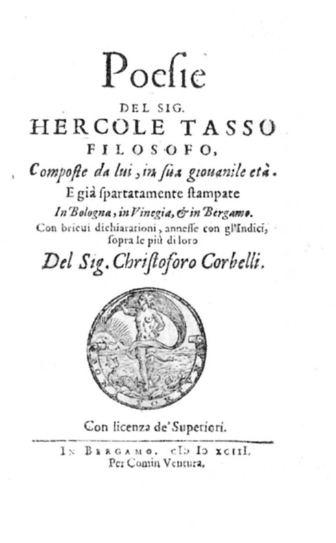Ercole Tasso (Bergamo, notizie dal 1556-1613), filosofo, poeta, letterato, uomo politico; visse molti anni a Bologna dove studiò legge e filosofia nella quale si addottorò. Fu consigliere della città di Bergamo e dal 1577 nunzio stabile a Venezia; cavaliere dell'Ordine dello Speron d'Oro. Più volte eletto membro del consiglio della Pietà, si interessò dell'epitaffio (1599) che celebra le gesta e i meriti di Bartolomeo Colleoni, ancor oggi leggibile ai lati del sepolcro del condottiero nella Cappella Colleoni; appare tra gli amministratori della Misercordia Maggiore e, nel 1592, tra i quattro cittadini deputati a scegliere il disegno dell'attuale Palazzo della Biblioteca. Pubblicò: Il confortatore (1595); Della realtà, & perfettione delle imprese (1612); Poesie (1613). E' cugino di Torquato.