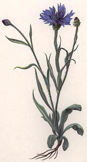 pianta erbacea annua spontanea (Centaurea cyanus) della famiglia Composite, detta anche ciano, con fiori periferici azzurri, centrali azzurro-porporini, in capolini.