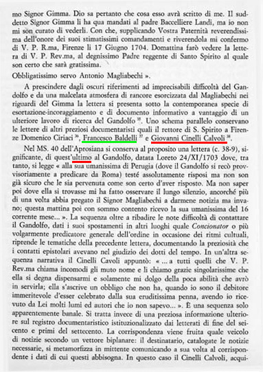 VEDI QUI NOTA SU F. BALDELLI IL CINELLI CALVOLI (NEL TESTO LA NOTA E' ATTIVA) DA' NELLA SUA BIBLIOTECA VOLANTE UN CHIARO GIUDIZIO POSITIVO DEL GANDOLFO ALTRESI' RINGRAZIANDOLO PER I FAVORI RICEVUTI E PER LA CURA DELLA "LIBRARIA DI VENTIMIGLIA" MA, DIMOSTRANDO LA NUOVA POSTAZIONE CRITICA DEL GANDOLFO, GLI RAMMENTA UN ERRORE CHE AVREBBE MAGARI EREDITATO DALL'APROSIO REPUTATO DAL CINELLI CALVI UN PO' TROPPO DI "COSTUMI INNOCENTI" O DA ALTRI, ISPIRATI COME L'APROSIO A ASCOLTARE TROPPO LE RELAZIONI ALTRUI SENZA INDAGARE CON RIGORE ANCHE SULLE FONTI. L'ERRORE DIPENDE DA UNA TRASCRIZIONE DEL GANDOLFO NEI SUOI FIORI POETICI IN MERITO AD AGOSTINO COLTELLINI (NEI FIORI POETICI... DEL GANDOLFO L'ERRORE SEGNALATO DAL CINELI CALVOLI A P. 221 SAREBBE QUESTO)