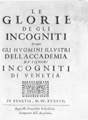 FRONTESPIZIO DE LE GLORIE DEGLI ACCADEMICI INCOGNITI: MOLTO BELLA E' L'ANTIPORTA DEL VOLUME IN CUI L'INCISIONE E' DEL PITTORE FRANCESCO RUSCHI NOTO PER I CONTATTI CON LA CERCHIA CARAVAGGESCA