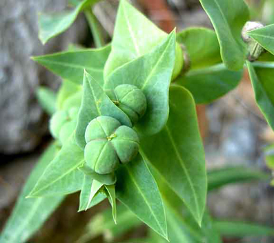 LATIRI = vedi sopra Euphorbia lathyris L. - Famiglia: Euforbiacee - Nome volgare: Catapuzia - Pianta erbacea biennale alta fino a 100 cm. con fusto semplice o poco ramificato; foglie sessili a forma di triangolo allungato, acute intere glabre. Il fusto termina con un'ifiorescenza a forma di ombrella a 3-5 raggi ramificati a loro volta. - Cresce in luoghi incolti, orti, ruderi. 0-1000 m. aprile - maggio - Proprietà farmaceutiche: Ricavato dal seme, l'olio, più violento di quello di ricino, si può usare come purgante - - La pianta è velenosa
