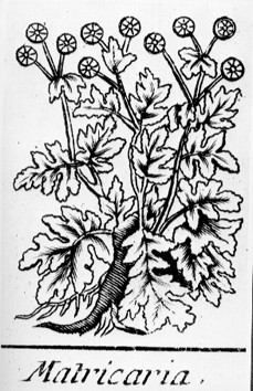Questa immagine della MATRICARIA è tratta da un antico Erbario laddove con tal nome si classificava mediamente la CAMOMILLA, appartenente però in diverse specie alla grande famiglia delle composite. Quella comune, qui effigiata, dalle notevoli proprietà calmanti, toniche e sadative è la MATRICARIA CHAMOMILLA e pur essendo meno appariscente della ANTHEMIS NOBILIS o CAMOMILLA ROMANA (detta anche stranamente CAMOMILLA INGLESE) possiede migliori qualità curative, qualità di cui peraltro erano già ampiamente edotti sia i medici romani che greci
