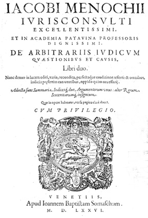 Giacomo Menochio pubblicò un'infinità di scritti a carattere giuridico, per la cui disanima si rimanda al sito del Servizio Bibliotecario Nazionale: basta qui ricordare che l'Aprosio si riferisce all'opera sopra riprodotta e precisamente Iacobi Menochii iuriconsulti excellentissimi, et in Academia Patauina professoris dignissimi, De arbitrariis iudicum quæstionibus et causis, libri duo. Nunc denuo in lucem editi, varia, recondita, perfectaque eruditione referti: & omnibus, iudicia præsertim exercentibus, oppido quàm necessarij. Adiecta sunt summaria, indicesque duo, argumentorum vnus: alter rerum, sententiarumque insignium. Quæ in opere habentur, versa pagina clarè docet,