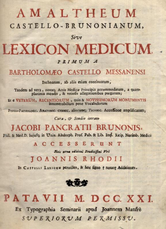 Alla prima edizione, col titolo Lexicon medicum Graeco-Latinum (Venetiis 1607), seguirono molte ristampe: a cura di E. Stupano, ibid. 1626, Basileae 1628; corretto da A. Ravenstein, Roterodami 1644, 1651, 1657, 1665; Lugduni 1667; Norimbergae 1682. Quest’ultima edizione è più nota col titolo Castellus renovatus, pubblicata con Mantissa Nomenclaturae medicae Hexaglottae di J. P. Bruno per i vocaboli arabici, ebrei, greci e francesi. Le edizioni successive portano il titolo Amaltheum Castellanum Brunonianum, Patavii 1699; con aggiunte di G. Rodio, ibid. 1713, 1721, 1746, 1755; Lipsiae 1713; Genevae 1741, 1746; Amsterdami 1746. Ma ancora nell’Ottocento l’opera era consultatissima.