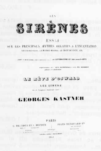 Il volume di cui sopra è proposta l'IMMAGINE (da biblioteca privata) fu edito nel 1858 (Paris, Brandus) da Georges Kastener sotto il titolo de Les Sirènes, essai sur les principaux mytes relatifs à l'incantation, les enchanteurs, la Musique Magique, le chant de Cigne; et consideres dans leurs rapports avec l'histoire, la Philosophie, la litterature et les beaux arts. Suivi de "La Rève d'Oswald ou les Sirenes, grande simphonie dramatique vocal et instrumentale: dalla lettura del titolo si evince che non è opera specificatamente dedicata al tema del CANTO MAGICO DELLE SIRENE ma che piuttosto, affrontando una sinfonia drammatica dedicata a queste creature mitologiche (per ben 207 pagine di musica notata e incisa), finisce per costituire un repertorio di pp.4+8+157+12 (con svariate tavole litografiche) sul
