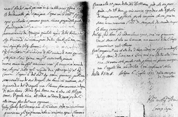 LETTERA (QUI SOPRA RIPORTATA NELLA PARTE FINALE CHE SI CONGIUNGE A QUELLA DEL TESTO A STAMPA) AD ANGELICO APROSIO DI LORENZO LEGATI DA BOLOGNA, DATATA 6 LUGLIO 1673: CUSTODITA IN BIBLIOTECA UNIVERSITARIA DI GENOVA - EPISTOLARIO APROSIANO