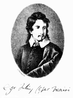 Giulio Cesare Vanini, il cui vero nome sembra essere Lucilio, studia filosofia e teologia a Roma e diritto a Napoli , dove si laurea nel 1606 ; prosegue gli studi di giurisprudenza a Padova e vi prende gli ordini carmelitani. Successivamente è in Svizzera , Olanda , Francia e in Inghilterra dove nel 1612 abiura la fede cattolica, ma nel 1614 è incarcerato per 49 giorni con l’accusa di aver attaccato la Chiesa anglicana .