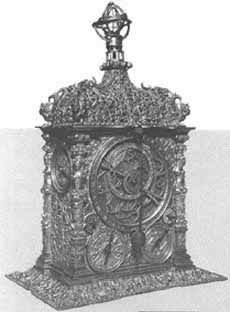 Orologio tedesco del sec. XVI Questo "pezzo" è un capolavoro della tecnica del '500: un orologio in metallo dorato cesellato. In alto vi sono una piccola sfera con lo Zodiaco e la Luna in argento. Nella parte posteriore, quella nella foto, vi sono il pendolo, l'astrolabio, gli ostensori del Sole e della Luna, comandati da un meccanismo interno, e la mostra per le ore, i giorni della settimana e i segni dello Zodiaco. La faccia anteriore reca, invece, un orologio per le ore diurne e notturne.