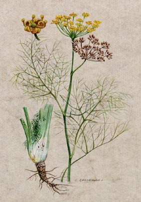 Proprieta': il finocchio, pianta assai usata nelle regioni mediterranee per aromatizzare carni e pietanze, oltre sali minerali e vitamine, contiene un'essenza, l'anetolo, che si concentra in particolar modo nei semi e favorisce la digestione.