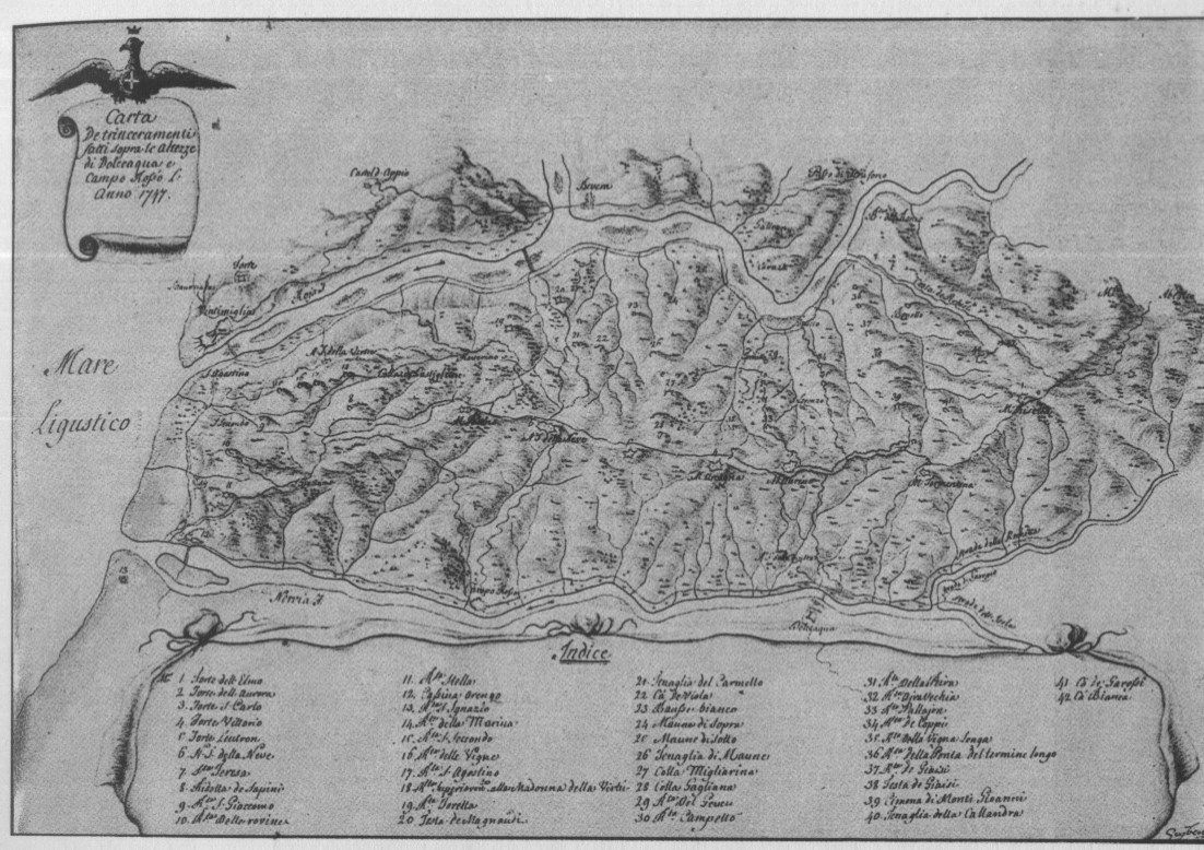 Guibert, Carta dei trinceramenti fatti sopra le altezze di Dolceacqua e Camporosso l'anno 1747 (Torino, Archivio di Stato, Carte topografiche segrete, 9 A II Rosso - Disegno a penna acquarellato di mm. 485 x 350 - edita a pag. 117 nel volume Marciando per le Alpi - Il ponente italiano durante la guerra di successione austriaca) CLICCA QUI PER RITORNARE ALLA "CARTA GUIDA COEVA DI ANONIMO SUI TRINCERAMENTI AUSTRO-SARDI" IN "CULTURA-BAROCCA"