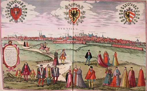 Tav. 43 - Nurnberg (Nürnberg, Norimberga, Germania) = BRAUN GEORG, Civitates orbis terraru, . Coloniae, Apud P. Gallaeum, Antuerpiae, 1572-1618, Incisori: Franciscus Hohenbergius (Franz Hogenbergh?), Simon Van den Noevel detto Novellanus