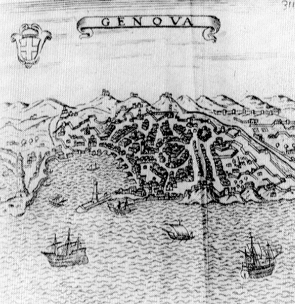 PIANTA DI GENOVA TRATTA DAL VOLUME DI FRANCIS SCHOTT ITINERARIO DE' VIAGGI PRINCIPALI D'ITALIA (VENEZIA, 1679): ECCO POI UNA RAPPRESENTAZIONE CARTOGRAFICA DEL DOMINIO DI TERRAFERMA DI GENOVA