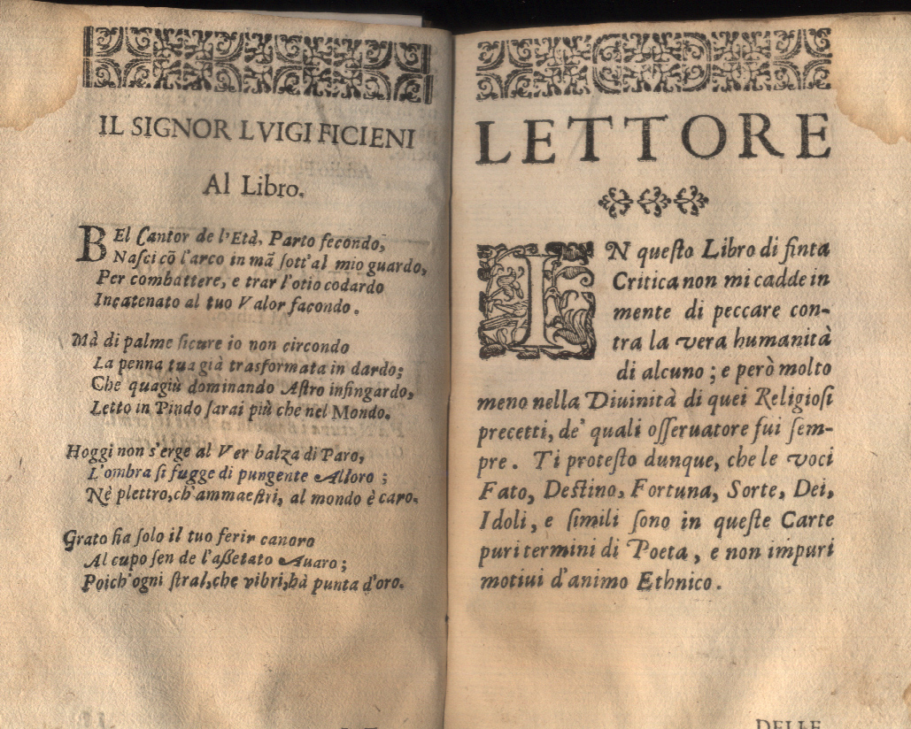 [qui da Cultura-Barocca è digitalizzata la II edizione Della Frascherie, piuttosto rara: è più facile reperire la I ed. veneziana del 1651 = l'edizione del 1654 è indicata "Lugd. Batav., apud Franciscum Hackium, 1672, in-8 piccolo, leg. coeva in piena pergamena floscia, pp. [16], 240": il Servizio Bibliotecario Nazionale nulla dice in merito ma per il vero luogo di stampa il Parenti, Dizionario dei luoghi di stampa falsi, inventati o supposti, p. 137 indica Venezia e non Leida. A riguardo della più reperibile stampa del 1658 il Servizio Bibliotecario Nazionale riporta invece "Probabilmente stampato a Venezia, cfr. C. Griffante, Le edizione veneziane del Seicento, Bibliografica, v. 1, p. 3 " = = è d aprecisare che per la I edizione compare la dicitura in basso sul frontespizio "Con Licenza de' Superiori, e' Previlegi Del Sommo Pontefice, Del Rè cattolico nello Stato di Milano. Della Serenissima Repubblica di Venetia e d'altri Potentati" che non compare nelle supposte stampe straniere: in tutte compare invece la sotto proposta pagina "al "Lettore"] CLICCA E VOLTA PAGINA