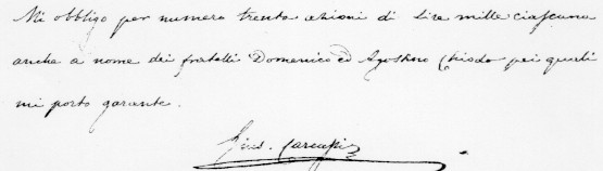 SI LEGGE NELL'ATTO: MI OBBLIGO PER NUMERO TRENTA AZIONI DI LIRE MILLE CIASCUNA, ANCHE A NOME DEI FRATELLI DOMENICO ED AGOSTINO CHIODO PEI QUALI MI PORTO GARANTE [RIPRODUZIONE DA DOCUMENTO ORIGINALE IN BIBLIOTECA-ARCHIVIO "MUSEO DELLA CANZONE DI VALLECROSIA (IM)"]