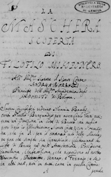 La Maschera Scoperta di Filofilo Misoponero ( inedito manoscritto di Angelico Aprosio in Biblioteca Universitaria di Genova = MS. E.II.39) redatta nel 1644, appartiene alla celebre disputa, "pregna di colpi di scena" su femminismo ed antifemminismo di Angelico Aprosio con ARCANGELA TARABOTTI = aspra fu la qui descritta disputa erudita sul tema tra "il Ventimiglia" soprannome di Aprosio con la dotta suora veneziana ed il bibliotecario intemelio la riprese spesso anche dopo la morte della donna: in effetti siffato "erudito contenzioso" fu innescato dall'