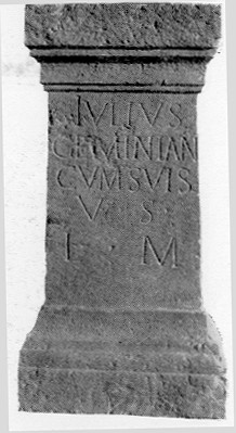 ARULA VOTIVA DI IULIUS GEMINIANUS: CON QUESTO CIPPO, SU CUI VERISIMILMENTE TRONEGGIAVA UNA STATUETTA DI UNA DIVINITA', IL DEDICANTE ASSIEME AI COMPONENTI DELLA PROPRIA FAMIGLIA SODDISFACEVA UN VOTO PER GRAZIA RICEVUTA (UNA GUARIGIONE, IL RITORNO DA UN VIAGGIO IMPEGNATIVO, UN SUCCESSO NEGLI AFFARI O IN POLITICA? QUESTA DOMANDA PROBABILMENTE NON AVRA' MAI RISPOSTA) (conservata in Raccolta Hanbury)