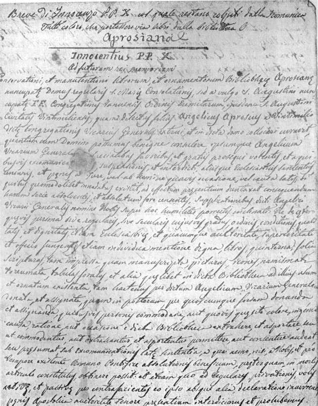 DEL 1653 DI PAPA INNOCENZO X: QUESTA COPIA, CUSTODITA NEL MS. 40 DELLA BIBLIOTECA APROSIANA, ERA UNO DI QUEGLI ESEMPLARI CHE, STANDO GLI ORDINI PAPALI, DOVEVA ESSERE SEMPRE AFFISSO ALLA VISTA DELLA PUBBLICA UTENZA
