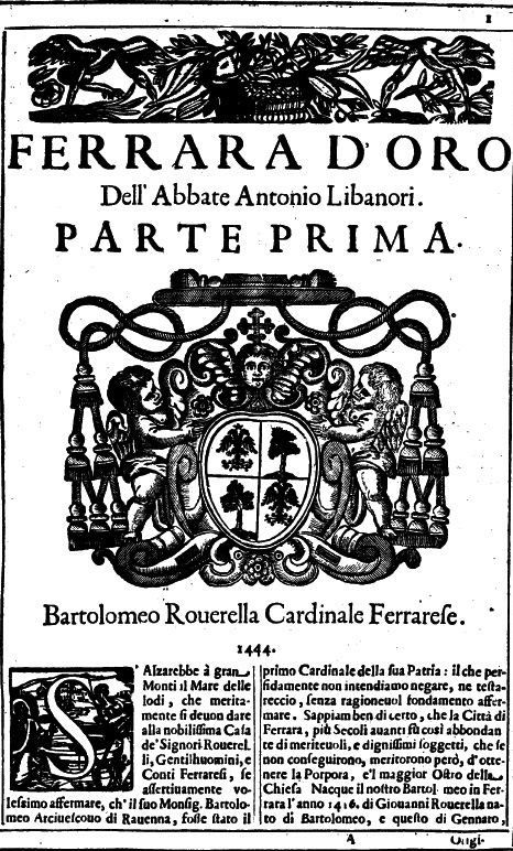 · 1: Parte prima. Che contiene le vite, & elogij degli eminentissimi signori cardinali; illustrissimi, e reuerendissimi patriarchi, arciuescoui, vescoui, prelati, e religiosi famosissimi, natiui di questa patria. Con l'arme delle loro famiglie, e la dichiaratione de' corpi, figure, e colori delle medesime arme. Al serenissimo principe cardinale Rinaldo d'Este