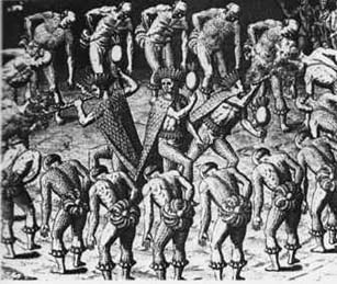 STAMPA EFFIGIATE UNA DANZA RITUALE DI POPOLAZIONI INDIO PRECOLOMBIANE: IL MANTELLO DEL PERSONAGGIO CENTRALE E' IDENTICO AL REPERTO DEL MUSEO SETTALIANO