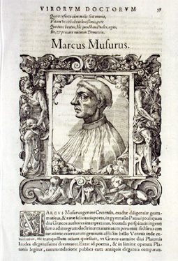 MUSURUS, MARCUS (c. 1470-1517), erudito greco, originario di Creta. Assai giovane divenne allievo di Giovanni Lascaris a Venezia. Nel 1505 fu eletto professore di greco a Padova, poi nel 1516 è fu chiamato a Roma da Leone X., che lo ha nominò arcivescovo di Monemvasia (Malvasia) nel Peloponnese, ma morì prima di lasciare l'Italia.