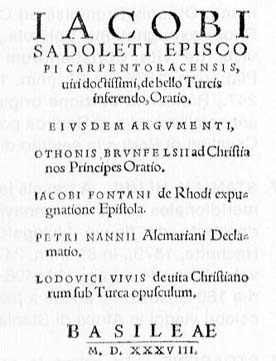 SADOLETUS IACOBUS, DE BELLO TURCIS INSERENDO ORATIO., EIUSDEM ARGUMENTI OTHONIS BRUNFELSII AD CHRISTIANOS PRINCIPES ORATIO, IACOBI FONTANI DE RHODI EXPUGNATIONE EPISTOLA., PETRI NANNI ALEMARIANI DECLAMATIO, LUDOVICI VIVIS DE VITA CHRISTANORUM SUB TURCA OPUSCULUM, BASILEA, THOMAS PLATTERUM, 1538, IN 8°, PP. 247: DA BIBLIOTECA PRIVATA E' QUESTO UN RARISSIMO ESEMPLARE TRATTANTE LA GUERRA DEI CRISTIANI COI TURCHI ED IN PARTICOLARE LA PRESA DELL'ISOLA DI RODI SOTTRATTA AI CAVALIERI DI RODI, POI CAVALIERI DI MALTA