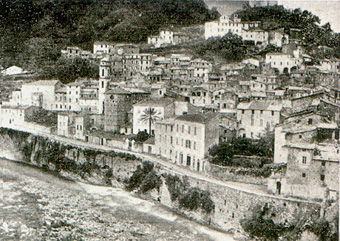 NELL'IMMAGINE ANTIQUARIA PROVENIENTE DALL'ARCHIVIO VENTIMIGLIESE DE APOLLONIA, MA GIA' RECUPERATA DA UNA CARTOLINA DATATA 1915, SI PUO' SCORGERE IL LATO SUD - OVEST DEL PAESE DI BADALUCCO CHE SEMBRA PROCEDERE IN MANIERA LINEARE DI CONSERTO AL TORRENTE ARGENTINA: COSI' GROSSOMODO IL D'ANDRADE POTE' VISUALIZZARE IL BORGO E QUINDI RIPRENDERLO PER LE SUE PREZIOSE ELABORAZIONI GRAFICHE