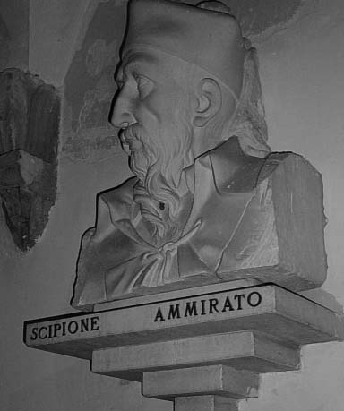 Scipione Ammirato nasce a Lecce nel 1531 da nobile famiglia di origine fiorentina. Studia diritto a Napoli, ove soprattutto frequenta circoli letterari, stringendo amicizia con i poeti Bernardino Rota e Angelo Di Costanzo. Vive a Roma, a Venezia, a Padova, e quindi a Lecce. Ancora in un soggiorno a Venezia è costretto ad abbandonare precipitosamente la città in seguito alla scoperta della sua relazione d'amore con una Contarini; rifugiatosi a Lecce, fonda l'Accademia dei Trasformati. Stabilitosi dapprima a Napoli, non incontra l'appoggio da parte degli spagnoli, che rifiutano di nominarlo storiografo del vicereame. Quindi nel 1569 si trasferisce a Firenze, bene accolto dal Gran Duca Cosimo; qui vive nel pieno riconoscimento dei suoi meriti letterari fino alla morte avvenuta nel 1601; nella vecchiaia volle essere ordinato sacerdote. Scrittore di grande versatilità lascia una produzione letteraria notevolissima per qualità e numero di titoli; dell'opera storiografica debbono ricordarsi: Istorie fiorentine (Parte prima, Firenze, 1600; Parte seconda, ivi, 1641-1647); Delle famiglie nobili napoletane (Parte prima, Firenze, 1580; Parte seconda, ivi, 1651); Delle famiglie nobili fiorentine (Firenze, 1615).
