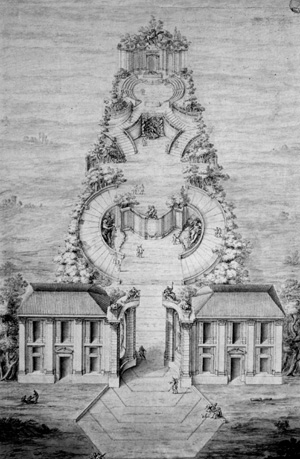 Il definitivo e stabile BOSCO PARRASIO (come si è già detto sopra) divenne sede dell'ACCADEMIA solo grazie alla generosità del re Giovanni V di Portogallo, che da vero mecenate donò all'istituzione 4.000 scudi, con i quali venne acquistato l'orto, di proprietà dei Livi, dove fu edificato il Bosco ad opera di Antonio Canevari, il quale, in qualità di Arcade, non si fece pagare. Egli elaborò un progetto (QUI PROPOSTO NELL'IMMAGINE SOPRA (FAI SCORRERE PER VISUALIZZARLA) che risolveva in maniera brillante la difficoltà dell'inclinazione del terreno: questo venne strutturato in tre ripiani, raccordati da rampe di gradini alternativamente concave e convesse, poste verso i confini laterali dell'area e sostenute da parapetti. Sul ripiano superiore trovò posto il TEATRO, di forma ovale, dove si trovano tre ordini di sedili di fronte ai quali c'è un leggio di marmo, dove i poeti declamavano i loro componimenti davanti all'attento uditorio. Quasi a far da quinta ad esso era un edificio, adibito ad archivio e segreteria (il cosiddetto SERBATOIO), opera di Giovanni Azzurri che lo rifece nel 1838, dotandolo di una facciata a forma di esedra, ornata da semicolonne scanalate . Sui lati della facciata sono affisse le tavole delle leggi, dodici secondo la tradizione romana. In alto l'iscrizione "Deo nato sacrum" ci dice che il bosco era dedicato a Gesù Bambino. Sul ripiano intermedio vi è una finta grotta, all'ombra di un pino gigantesco,. Nel ripiano inferiore vi è, invece, una grande edicola di marmo che racchiude un'iscrizione del 1726 che ricorda la donazione del re di Portogallo. Tutto il complesso è arricchito da maestosi lauri, magnolie, cipressi, pini, oleandri e glicini. Dopo il primo periodo di successo incontrastato che durò quasi un secolo, arricchito dalla presenza di numerosi uomini illustri, iniziò il declino dell'Arcadia, finché, verso la fine del Settecento, il Bosco venne miseramente abbandonato. Fu poi riaperto nel 1839, dopo il restauro e il rifacimento del Serbatoio. Oggi il Bosco è sempre di proprietà dell'Accademia, anche se negli ultimi anni la proprietà fu data in affitto ad una nota personalità del mondo politico e sportivo: pertanto la visita al giardino è permessa soltanto previa richiesta scritta al Custode Generale dell'Accademia [testo parzialmente tratto da ROMA SEGRETA - ON LINE].
