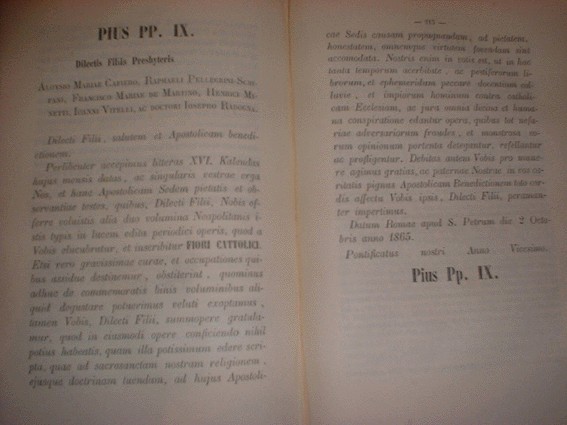 E sebbene le gravissime cure e le occupazioni onde siamo assiduamente intrattenuti, Ci abbiano impedito di potere altresi', siccome ne abbiamo vaghezza, pregustare alcun che de sullodati due volumi: ciò nullameno sommamente Ci congratuliamo con Voi, diletti Figliuoli,perché nella compilazione di quell'opera null'altro vi stia più a cuore che divulgare per le stampe segnatamente quegli scritti i quali sieno dettati nello scopo di difendere la sacrosanta Religione e i suoi insegnamenti e di propugnare la causa di quest' Apostolica Sede, di fomentare la pietà, l'onestà, ed ogni altra virtù. Imperccicché è Nostro vivo desiserio, che nella sì grave tristezza de' tempi presenti, e nelle colluvie di libri pestiferi e di effemeridi che apprendono a fare il male, e nella cospirazione di uomini empii contro la Chiesa Cattolica e contro ogni diritto divino ed umano, siano pubblicate quelle opere, nelle quali i tanti scellerati inganni dei nemici e le mostruose stranezze delle loro opinioni siano messe anudo, coninte di errore e di empietà, e del tutto abbattute. Quindi vi rendiamo le debite grazie pel dono, ed in pegno del Nostro paterno amore verso di voi, l'Apostolica Benedizione a voi medesimi, Diletti Figliuoli, con tutta la effusione del cuore amorevolmente impartiamo. / Roma da S. Pietro addì 2 Ottobre dell'anno 1865 / Del Pontificato Nostro l'anno ventesimo/ PIO PP. IX".