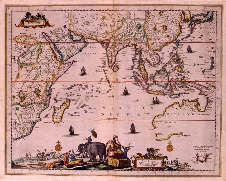 Fu il francese De Gonneville, nel 1503, che per primo forse toccò il litorale dell'AUSTRALIA. Nel 1531 le carte di Oronce Fine segnalavano la presenza di un continente australe sotto il nome di Java Grande ; un portolano italiano del 1578, citato dal dotto inglese Major, traccia la costa N dell'Australia con l'indicazione Meridional discoperta nuovamente. Ma i geografi del tempo ne fanno il limite di un immenso continente intorno al polo sud. La scoperta del continente nuovissimo è dovuta , come ricognizione iniziale, ai portoghesi, e quindi ad olandesi e poi inglesi. Nel 1606 la nave olandese Duyfken, partendo dall'isola Frederik Hendrik presso la costa SO della Nuova Guinea, navigò nel golfo di Carpentaria lungo la costa O della penisola di capo York al comando di W. Janszoon e giunse al capo Keerweer. Nel medesimo anno lo stretto di Torres fu riconosciuto dallo spagnolo L. V. de Torres, che si spinse fino a Callao. Nel 1616 l'olandese D. Hartogszoon scoprì le coste occidentali del continente, e la nave Eendracht toccò l'angolo SO, ov'è il capo Leeuwin (1617-19). Nel 1623 le navi Pera e Arnhem proseguirono le scoperte verso il golfo di Carpentaria. Nel 1636 la IV spedizione olandese scoperse la Terra di Van Diemen presso l'11° di lat. S, ove è l'isola detta di Melville. Nel 1642, durante la V spedizione olandese, A. J. Tasman fece la ricognizione meridionale dell'Australia e scoprì la grande isola a S, che chiamò isola Van Diemen in onore del governatore delle Indie Olandesi nome che più propriamente si adattava nel sistema politico dell'epoca alle nuove terre: e forse proprio per questa dominazione olandese Aprosio filoiberico, oltre che naturalmente cattolicissimo, non approfondì in dettaglio la documentazioni sulle nuove contrade di cui si venivano a sapere sempre nuove, affascinanti cose [vedi sopra una seicentesca carta da collezione privata della Nuova Olanda: carta di H.Allard, [Amsterdam, c. 1660], Nova Tabula India Orientalis 56.5 x 45.5cm.]