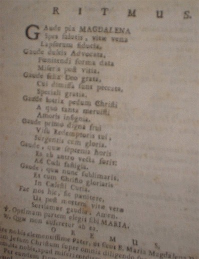 A SPECIFICAZIONE DEL RITMO OD INNO ALLA MADDALENA IL SERIO ANCORA SCRIVE:"CHI VUOL CELEBRARE LA SETTENA DELLA SANTA POTRA' CONFESSARSI E COMMUNICARE PER SETTE DOMENICHE PRIMA DELLA FESTA DELL'ISTESSA, QUALE OCCORRE I 22 DI LUGLIO E NELLE MEDESIME POTRA' RECITARE I SOPRADDETTI GAUDII; AGGIUNGENDOVI UN'AVE MARIA PER GAUDIO. E PUO' BENE SPERARE CHE LA MEDESIMA SANTA GLI IMPETRERA' DA NOSTRO SIGNORE IL DOLORE PER I SUOI PECCATI, E TUTTE QUELLE GRAZIE, CHE SI CONFARRANNO ALLA SALUTE ETRNA, COME ANCHE DI ESSERE ASSISTITO IN TUTTI I TRAVAGLI"