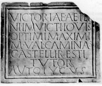 L'epigrafe (v. C.I.L. V, 7809 e G.MENNELLA, "Un'epigrafe di Taggia da riabilitare: CIL V, 7809" in Atti della Società ligure di Storia Patria, XXIV, 1984) è da leggere: "Victoriae aeter/ni imvicti(!) Iovis/ optimi maximi/ M(arcus) V(alerius) Caminas/ castelli restitutor/ Autoycus".