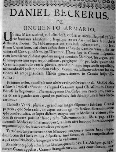 Tuttavia quanto lui stesso non individuņ, al contrario lo osservarono altri illustri Medici: ed č anzi da far notare che, ancora adesso presso il celeberrimo farmacista del Duca di Borussia nel territorio Regiomontano il Signor Gaspare Pancero, appassionato di cose rare ed esotiche, si trova qualche cranio portato via dal patibolo e ricoperto di usnea...".