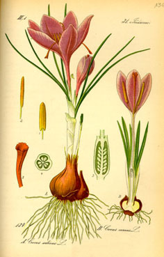 Il Crocus sativus (Zafferano) è una pianta della famiglia delle Iridaceae . Il suo fiore varia dal lilla chiaro al viola purpureo. Importante economicamente in quanto da esso di ricava lo ZAFFERANO (vedi sopra immagine) , preziosa spezia utilizzata nella preparazione di cibi raffinati (sulle "spezie" leggi qui quanto ne scrisse PAOLO GIOVIO in merito ad una VIA ALTERNATIVA GENOVESE del COMMERCIO DELLE SPEZIE).