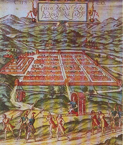 Incisione della capitale inca di Cuzco realizzata nel 1594 da G.Braun: vedi qui un particolare dell'antica cinta muraria di Cuzco