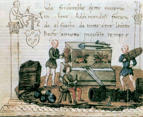 MINIATURA DA MANOSCRITTO DEL XVI SECOLO DI METALLURGIA: ATTIVITA' NEI FORNI PER LA PRODUZIONE DI BOMBARDE