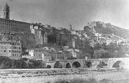 FOTOGRAFIA OTTOCENTESCA DA "SITO INFORMATICO MUSEO G. ROSSI DI VENTIMIGLIA": SI VEDONO IL PONTE RINASCIMENTALE SUL ROIA E, GRAVITANTE SUL CENTRO ABITATO MEDIEVALE, IL CORPO MASSICCIO DI FORTE SAN PAOLO