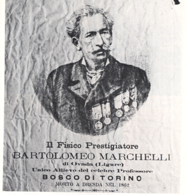 IL GARIBALDINO BENEDETTO MARCHELLI (QUI IN UNA STAMPA DELL'ACCADEMIA URBENSE, OVADA) RAGGIUNSE BUONA FAMA COME ILLUSIONISTA E PRESTIGIATORE QUAL ALLIEVO DI BARTOLOMEO BOSCO, MAESTRO DELL'ARTE DELL'ILLUSIONISMO E DELLA PRESTIDIGIAZIONE E SI ESIBI' ANCHE NEL PONENTE LIGURE. COME SI LEGGE NELLA STAMPA POPOLARE (CONSEVATA PRESSO L'ACCADEMIA URBENSE DI OVADA)