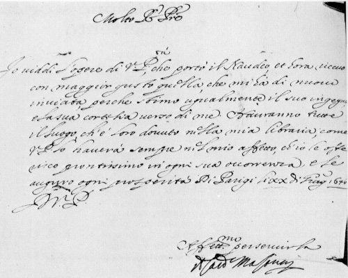 Io viddi l'opere di Vostra paternità che portò il Naudeo et hora ricevo con maggior gusto quella che mi ha di nuovo inviata, perché stimo ugualmente il suo ingegno e la sua cortesia verso di me. Havranno tutte il luogo, ch'è loro dovuto nella mia libraria, come Vostra Signoria lo haverà sempre nel mio affetto, ch'io le offerisco prontissimo in ogni sua occorrenza, e le auguro ogni prosperità.