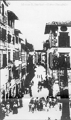 MONTE SAN SAVINO - CORSO SANGALLO IN UNA VEDUTA D'EPOCA (IN PRIMO PIANO LA "GUGLIA") USA LE SOTTOSTANTI FRECCE PER SCORRERE L'ELENCO AVANTI O INDIETRO