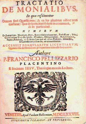 IL VOLUME, DI CUI SOPRA SI VEDE IL FRONTESPIZIO, FU OPERA DEL DISCUSSO MA GENIALE GESUITA FRANCESCO PELLIZZARI CHE NELL'OPERA AFFRONTO' TRA L'ALTRO IL DELICATO PROBLEMA DELLE MONACAZIONI FORZATE