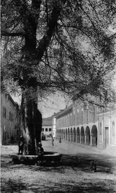 IMMAGINE ANTIQUARIA DELLA PIAZZA DI PONTINVREA: A DESTRA DI CHI GUARDA FACCIATA DELLA CHIESA DI S. LORENZO AFFIANCATA DAL PALAZZO MARCHIONALE CARATTERIZZATO DALL'AMPIO PORTICATO CON VOLTE A CROCIERA DA RACCOLTA PRIVATA