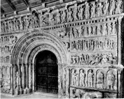 Facciata del monastero benedettino di Santa Maria di Ripoll in Catalogna. Fu realizzato dal monaco tedesco Arnaldo de Walter nella prima metà dell'XI secolo. L'iconografia delle sculture deriva dalle contemporanee Bibbie miniate catalana: lo spazio risulta diviso come in un polittico