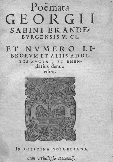 L'umanista, filologo, poeta, rettore dell'Università Albertina Georgius Sabinus Schuler vide la luce nel 1508 a Brandeburgo e si spense nel 1560 a Francoforte: tra le sue tante opere un posto di rilievo spetta ai classicheggianti Poemata di cui vedasi sopra il fronte. Un'edizione dell'opera si trova anche a Torino: