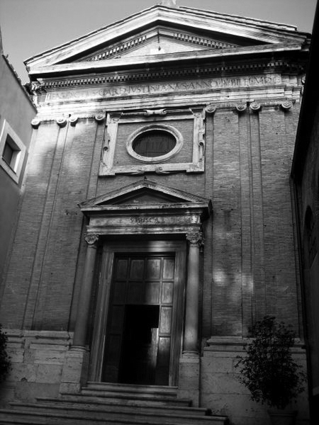SANTA PRISCA è una chiesa di Roma, situata sull'Aventino, dedicata a santa Prisca, una martire del I secolo. Fu costruita nel IV o V secolo su un preesistente tempio di Mitra. Il Titulus Priscae fu registrato negli atti del sinodo del 499. Danneggiata dai Normanni nel Sacco di Roma (1084), la chiesa fu restaurata molte volte. L'aspetto attuale è quello del restauro del 1660, che previde una nuova facciata.All'interno le colonne sono l'unico elemento che rimane della chiesa antica. C'è anche un fonte battesimale che secondo la tradizione fu usato da san Pietro. Tra i cardinali titolari del Titulus S. Priscae ci fu Angelo Roncalli (1953), il futuro papa Giovanni XXIII [da Wikipedia, l'enciclopedia libera on line]