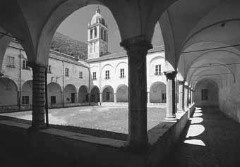N. Lamboglia scrisse nei Monumenti del Ponente Ligure (Torino, 1970, p.107):" Pure esterno al BORGO DELLA PIEVE, fin dalle origini, fu il grande CONVENTO DEGLI AGOSTINIANI SCALZI ridotto in stato avvilente negli ultimi decenni, con la chiesa ed il campanile di costruzione cinquecentesca; unico e meravigliosamente integro resta il chiostro del XVI secolo, il pił vasto di tutta la Liguria occidentale e il pił arioso di proporzioni e di volumi, gią largamente permeato di echi rinascimentali; colonne, capitelli ed archi sono tuttavia ancora scolpiti secondo la tecnica tradizionale e completano il panorama dell'arte ligure medievale nella sua espressione pił attardata". (FOTOGRAFIA DI MARIO DE APOLLONIA)