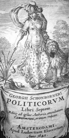 Georg Schonborner (1579-1637) fu giurista olandese e uomo politico di grande fama. L'opera di cui sopra si vede il frontespizio e che proviene da una collezione privata, volutamente rimasta anonima, indaga sopra le prerogative del principe e la struttura dello stato e fu realizzata sulla scia della dottrina lipsiana divenendo ben presto un classico del pensiero politico tedesco.